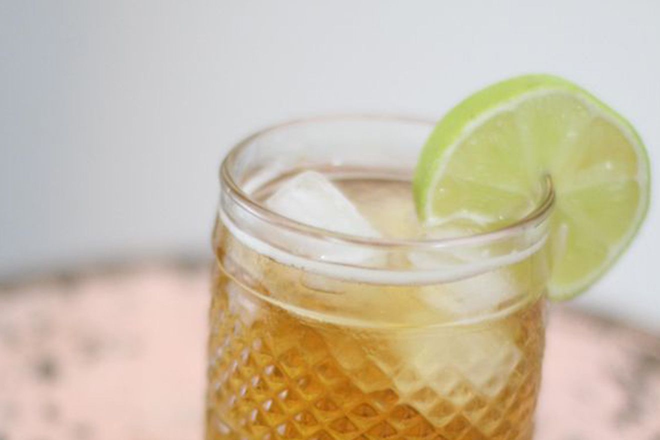- Voeg het gemberbier toe, langzaam gieten zodat het bovenop de rum blijft drijven.